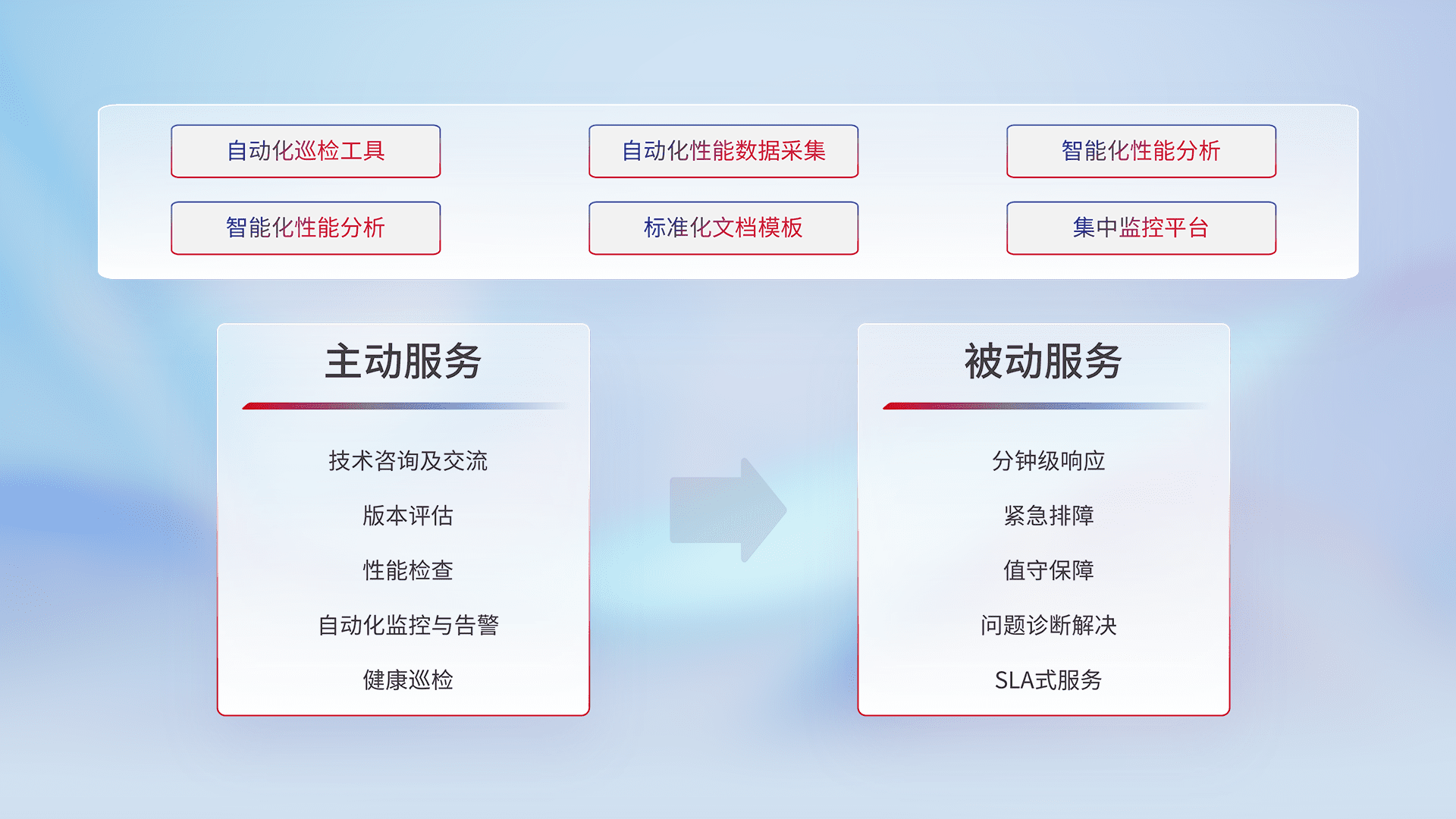 智能化工具和标准化文档,,保障服务质量,,,提供主动服务(包含技术咨询、、、版本评估、、、、性能检查、、自动化监控与告警、、健康巡检)和被动服务包含(分钟级响应、、、紧急排障、、、值守保障、、问题诊断解决、、SLA服务)。。