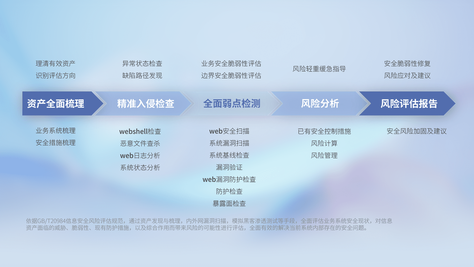 针对客户行业特性,,以专业的安全服务+多厂商联合解决方案提供专属的一站式安全管理服务,,帮助客户全面感知网络空间威胁,,,基于识别、、、检测、、分析、、、防护、、、、监测、、、、响应的服务理论模型,,从方案咨询、、集成交付、、评估验证、、、优化加固、、、运维运营,,致力于为客户提供完整的闭环管理式安全服务。。。以实战经验为客户打造高抵御风险的安全体系,,帮助客户发现威胁、、对抗威胁、、处置威胁,,不断积累安全对抗能力,,,持续保障数字化安全。。。。
